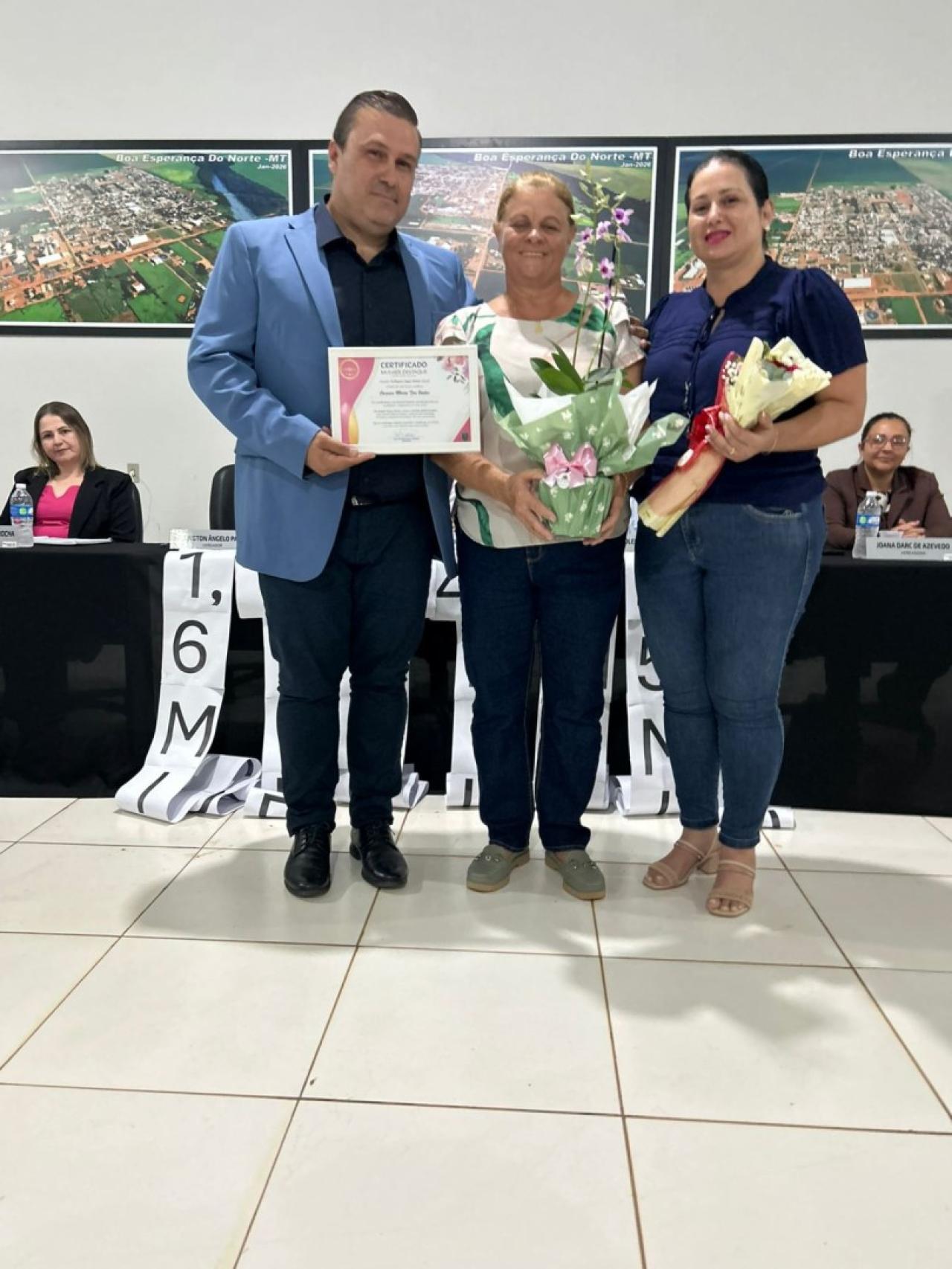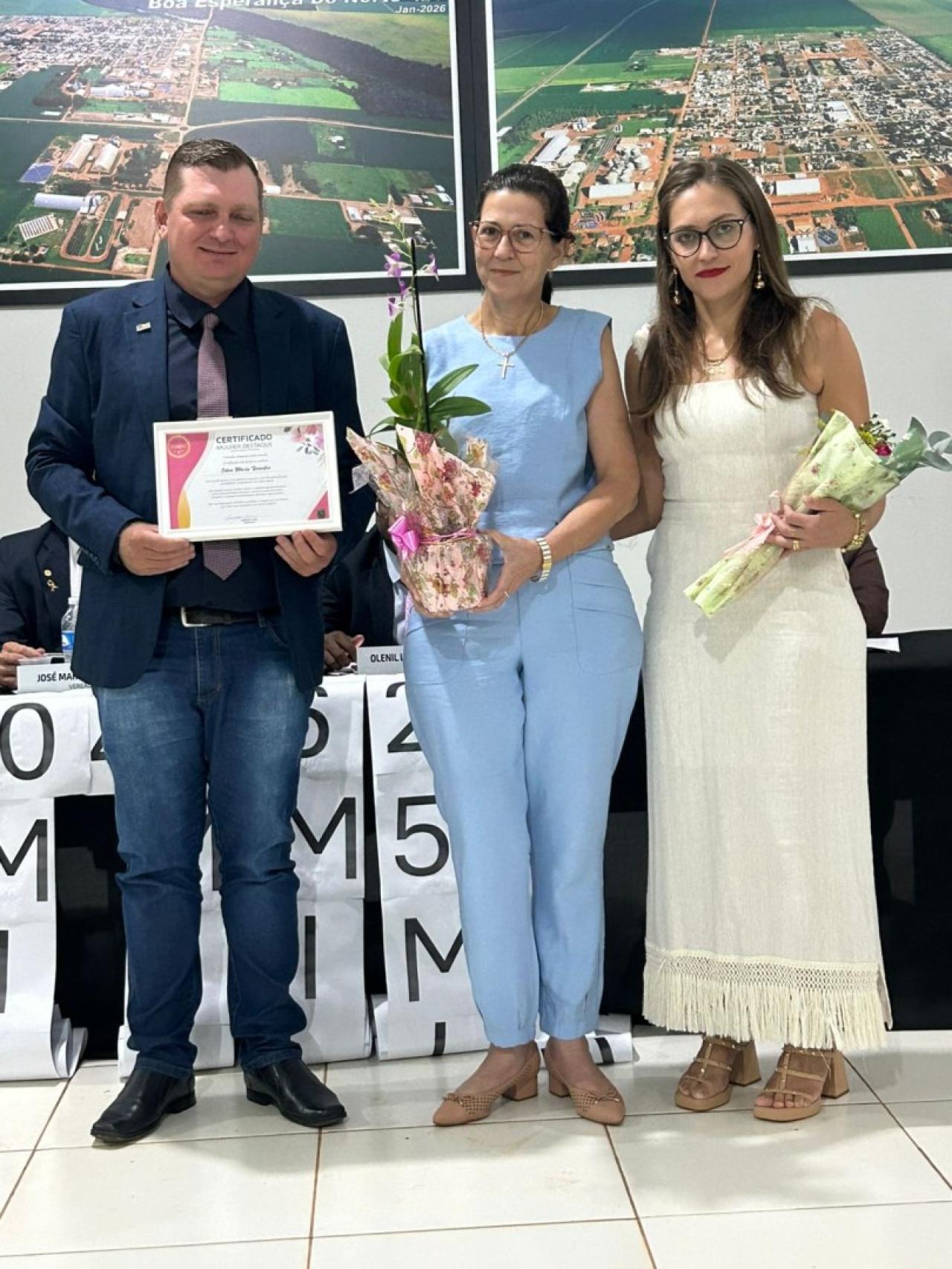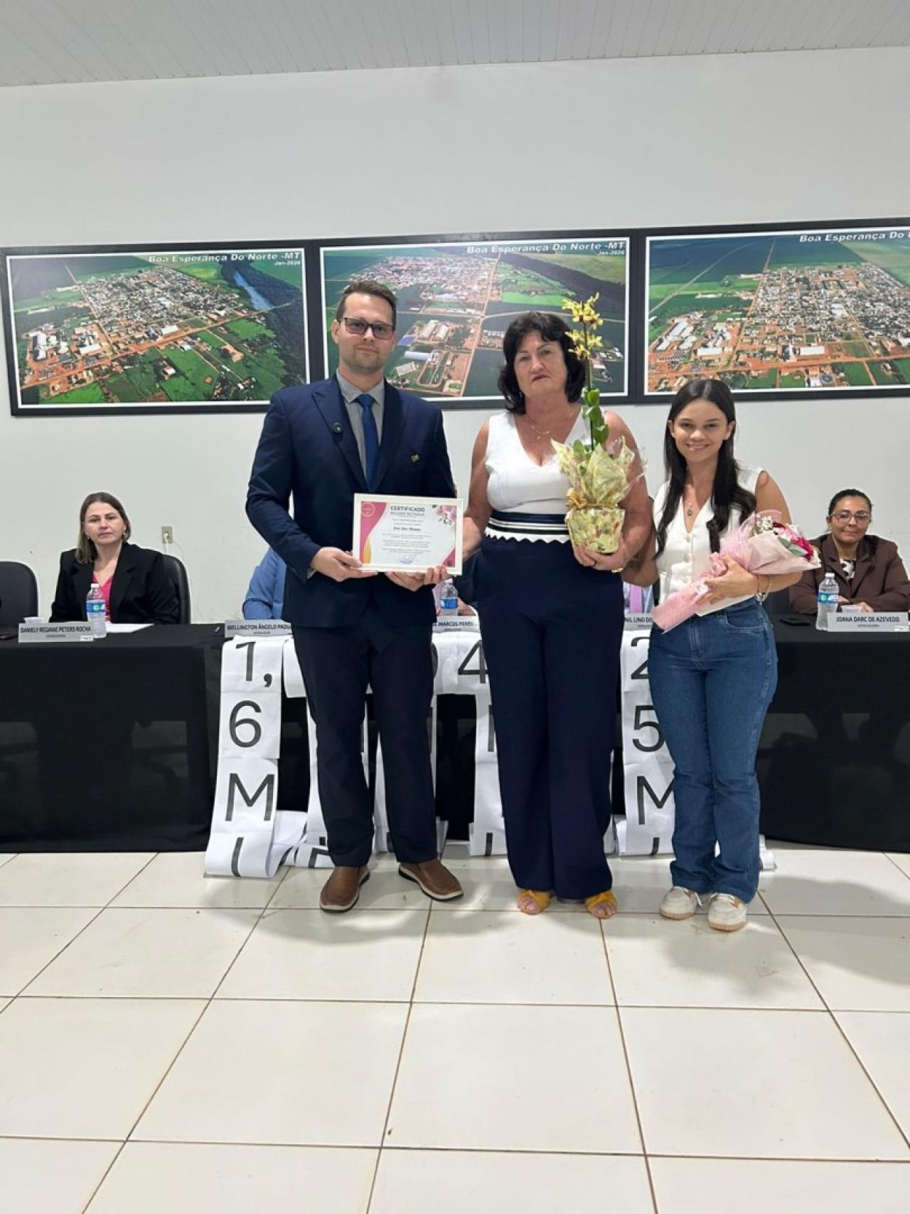 Em 09 de março, a Câmara Municipal de Boa Esperança do Norte realizou sua 3° Sessão Ordinária do ano de 2026, em oportunidade os vereadores prestaram homenagem a mulheres do município com a entrega do título “MULHER DESTAQUE” autorizado através do DECRETO N° 002/2026, que frisa em seu Art. 2° "A homenagem será destinada a mulheres que se destacarem no município de Boa Esperança do Norte – MT nas áreas social, educacional, cultural, empresarial, esportiva, comunitária ou em outras atividades de relevante interesse público" de autoria dos vereadores PROFESSORA DANIELY – DC E PROFESSOR WELLINGTON – UNIÃO BRASIL e demais vereadores.
