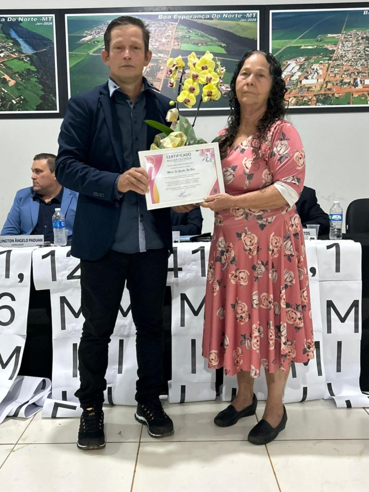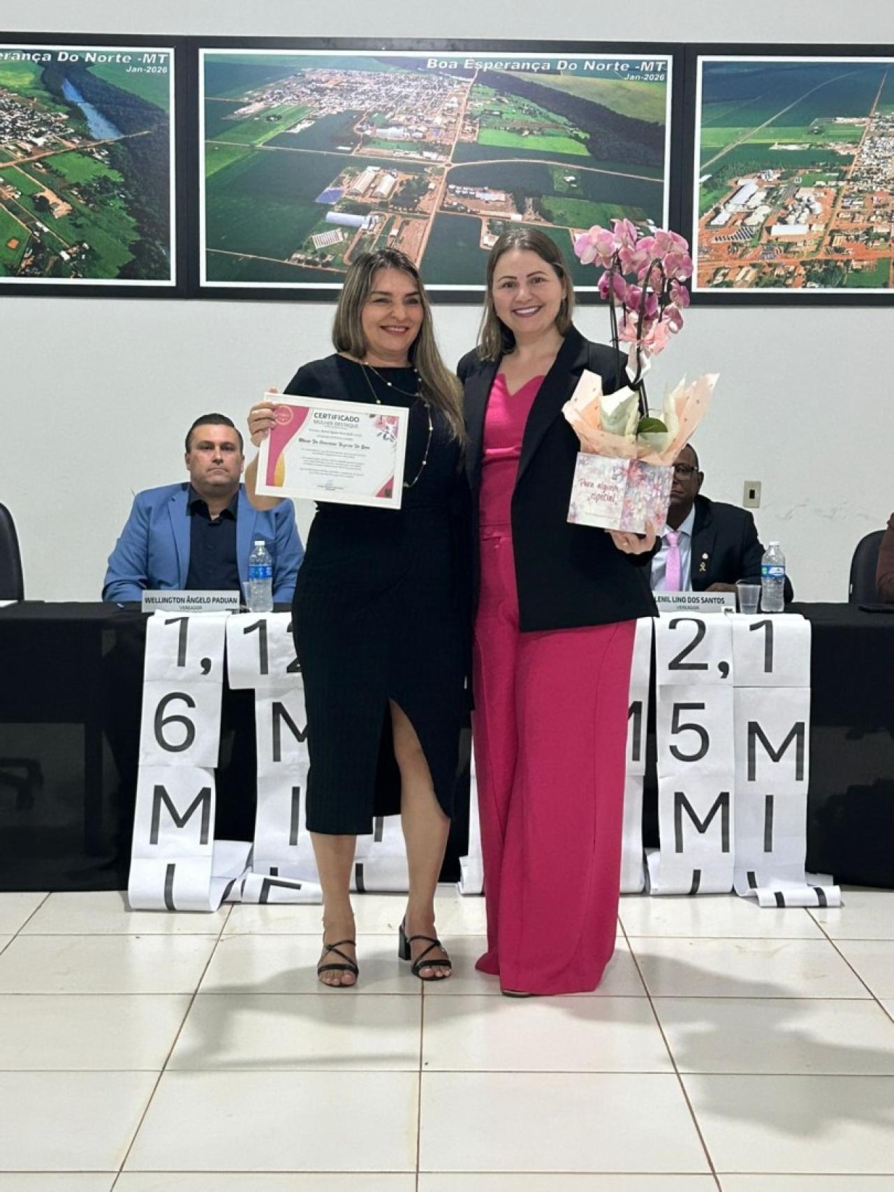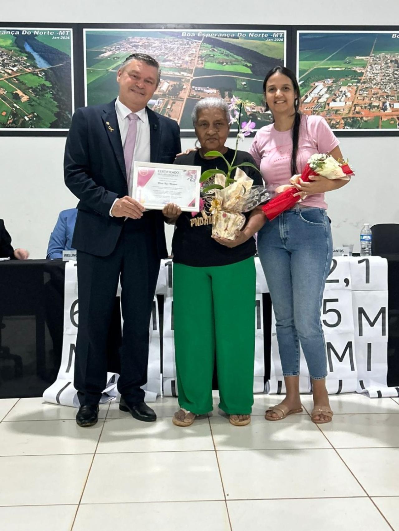 Em 09 de março, a Câmara Municipal de Boa Esperança do Norte realizou sua 3° Sessão Ordinária do ano de 2026, em oportunidade os vereadores prestaram homenagem a mulheres do município com a entrega do título “MULHER DESTAQUE” autorizado através do DECRETO N° 002/2026, que frisa em seu Art. 2° "A homenagem será destinada a mulheres que se destacarem no município de Boa Esperança do Norte – MT nas áreas social, educacional, cultural, empresarial, esportiva, comunitária ou em outras atividades de relevante interesse público" de autoria dos vereadores PROFESSORA DANIELY – DC E PROFESSOR WELLINGTON – UNIÃO BRASIL e demais vereadores.